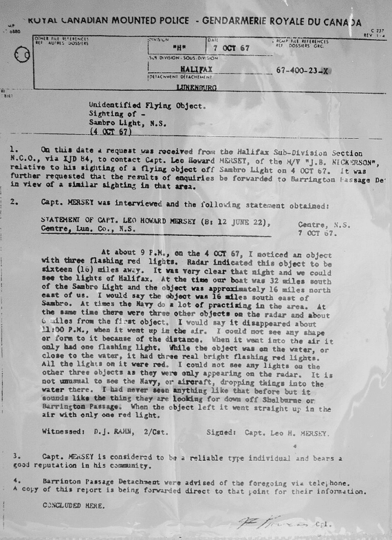 Ebenfalls zur etwa gleichen Zeit befand sich Kapitän Leo Howard Mersey im Steuerhaus seines Schiffes. Eine Tätigkeit, die für ihn Routine war. Doch diese Routine wurde unterbrochen, als er auf seinem Decca-Radar plötzlich vier ortsfeste Punkte beobachtete. Auch seine Besatzung, die aus ca. 20 Fischern bestand, war bereits auf dieses seltsame Phänomen aufmerksam geworden. Sie alle standen an Deck und beobachteten das Objekt am Himmel.
